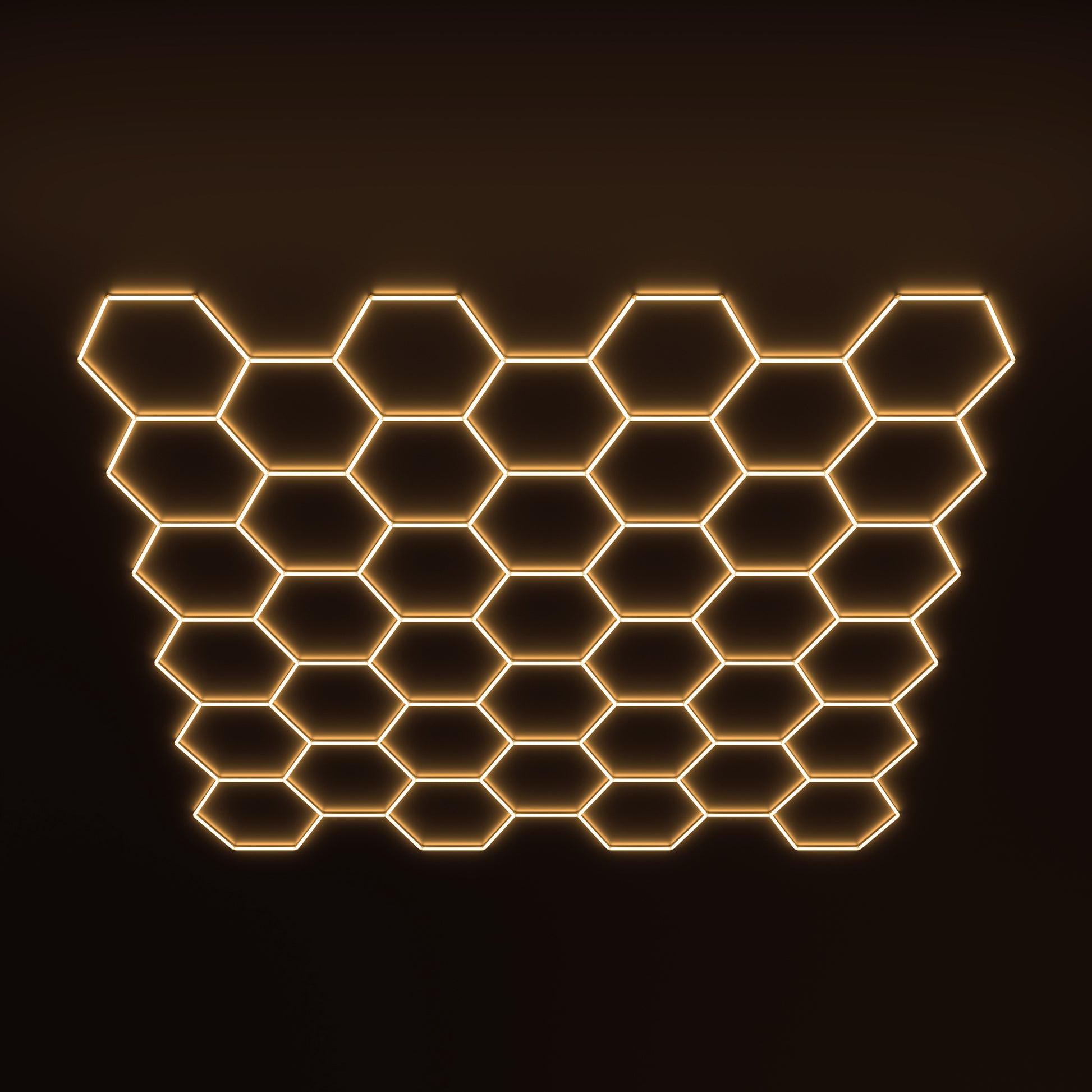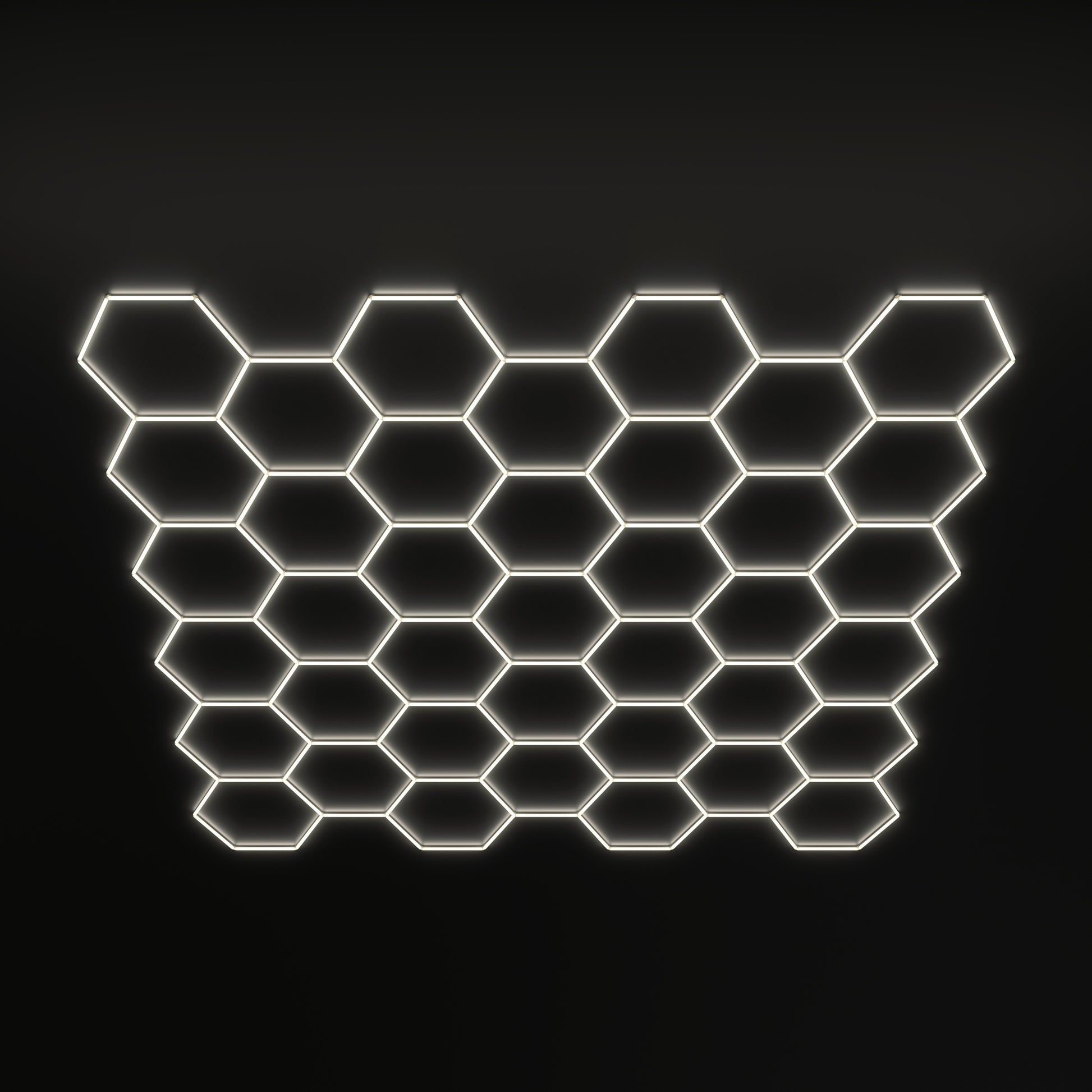 Large Hexagon Lighting grid spanning 17 x 16.5 feet with 39 bright LED hex shapes consisting of light weight aluminum tubes and connectors which is easy to assemble and can be hung or suspended to fit any garage, office, studio, or gym space.