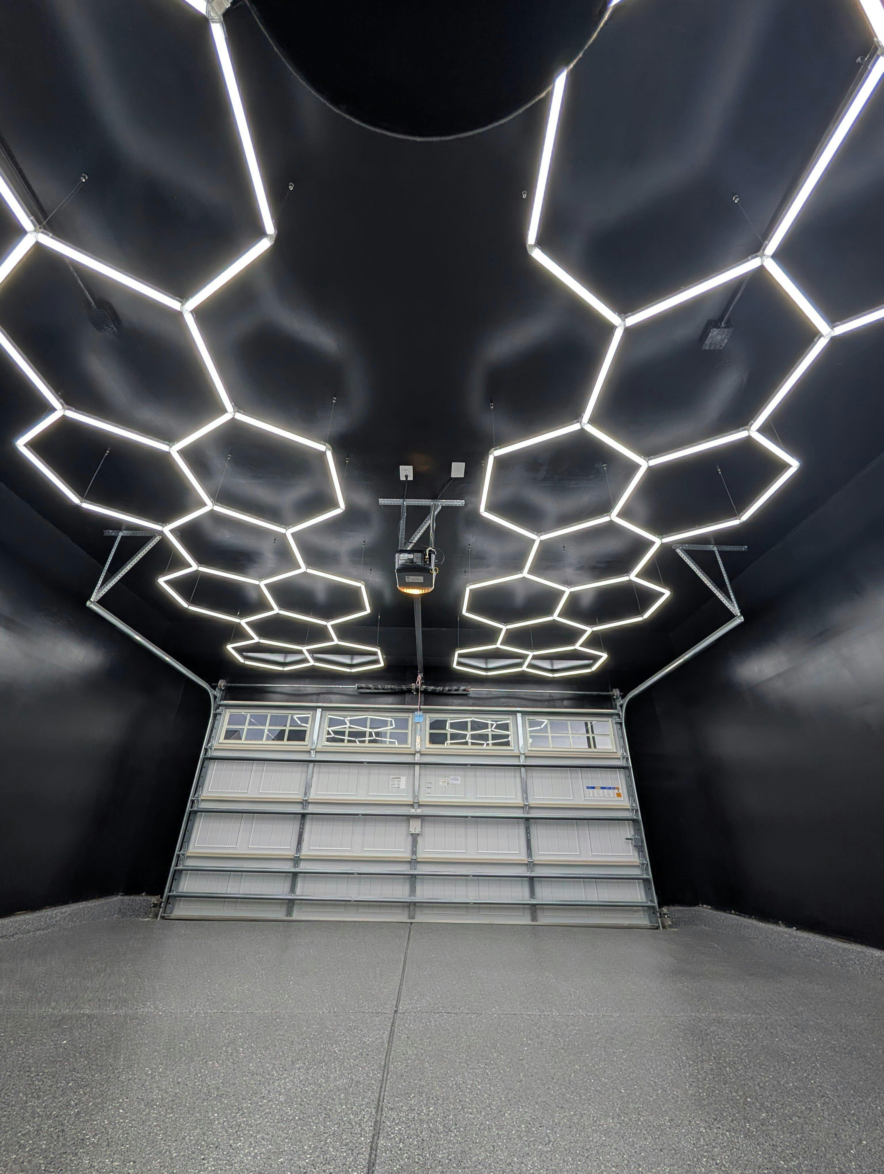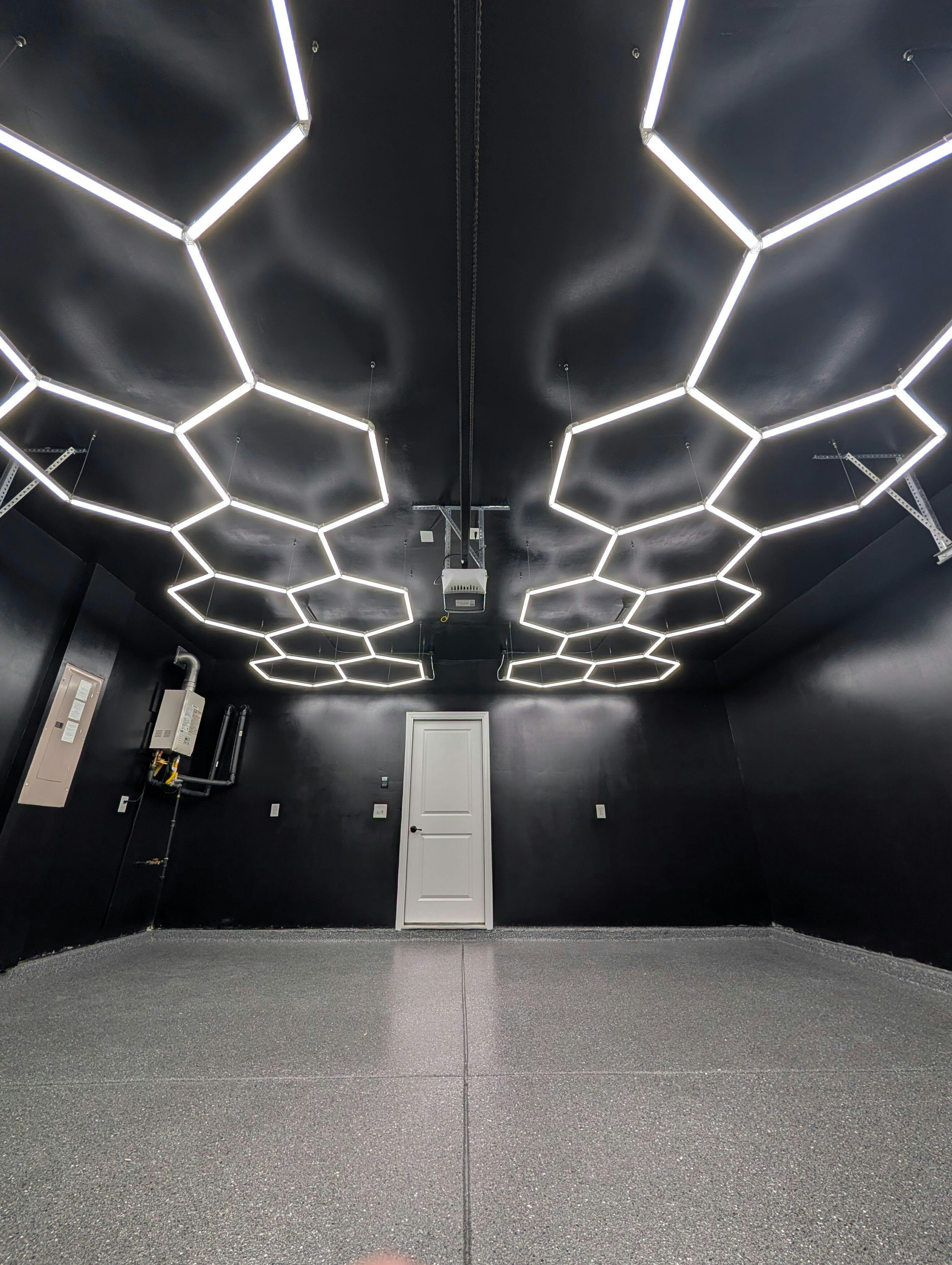 Hexagon LED lighting in luxury auto detailing garage